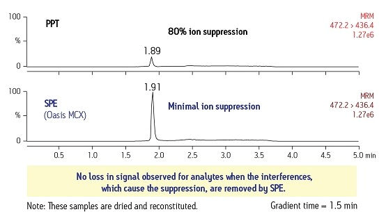 在有些情況下,源自樣品基質(zhì)的干擾物可能會(huì)增加某種化合物的信號(hào),這叫做離子增強(qiáng),可導(dǎo)致響應(yīng)值偏高。適當(dāng)?shù)腟PE方法可通過(guò)將干擾物與該化合物分離開來(lái)而最大限度減弱這種效應(yīng),從而使響應(yīng)值更準(zhǔn)確。