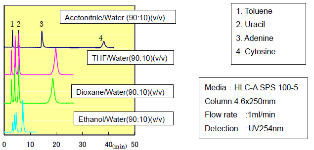 乙腈、THF和二氧六環通常溶解在水中作為流動相使用,而不會產生氫鍵相互作用。在高水相的條件下,洗脫時間變快。雖然反相體系常用于水溶性化合物的分離,但是HLC硅膠更適合用于極性化合物的分離。
