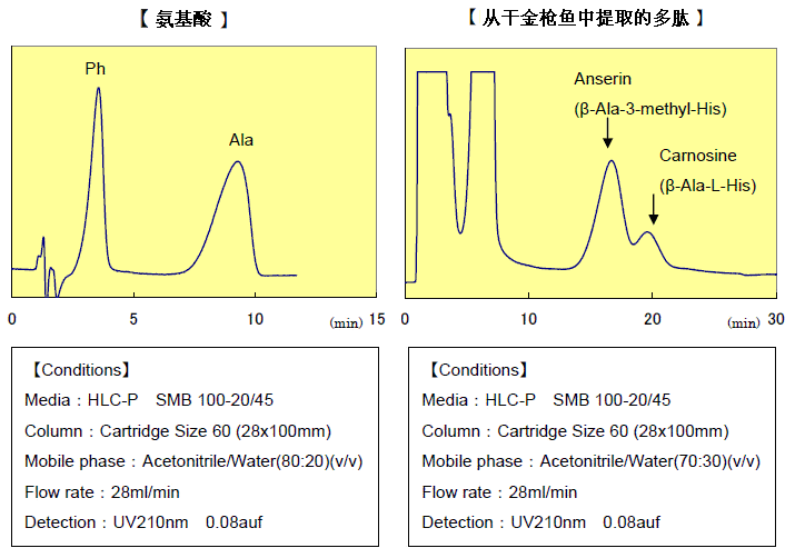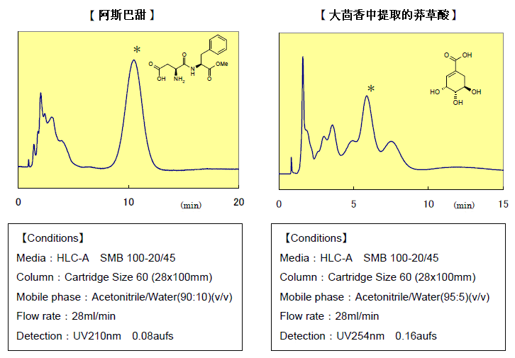 在HILIC模式下,初始流動相條件用的是高比例有機溶劑和水。這種洗脫體系使得單一化合物得到分離,并且之后的處理步驟也相對簡化(旋蒸或者凍干)。洗脫體系中水含量的增加,使得樣品更容易被洗脫出來。因此,在HILIC模式中,與水易混合的有機相體系最為常用,比如乙腈-水體系。以下應用給出了使用HLC-A硅膠,在乙腈-水等度體系中,分析和制備的應用。