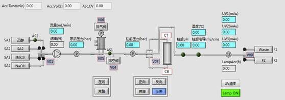層析系統(tǒng)軟件符合新版GMP規(guī)范,采用圖形化界面、全自動操作,簡明扼要,任何操作及狀態(tài)均可實(shí)時顯示在主界面狀態(tài)欄中,自動化程度高。結(jié)合了大量的容錯性設(shè)計,貼合生產(chǎn)實(shí)際,降低了對研發(fā)人員的技能要求。