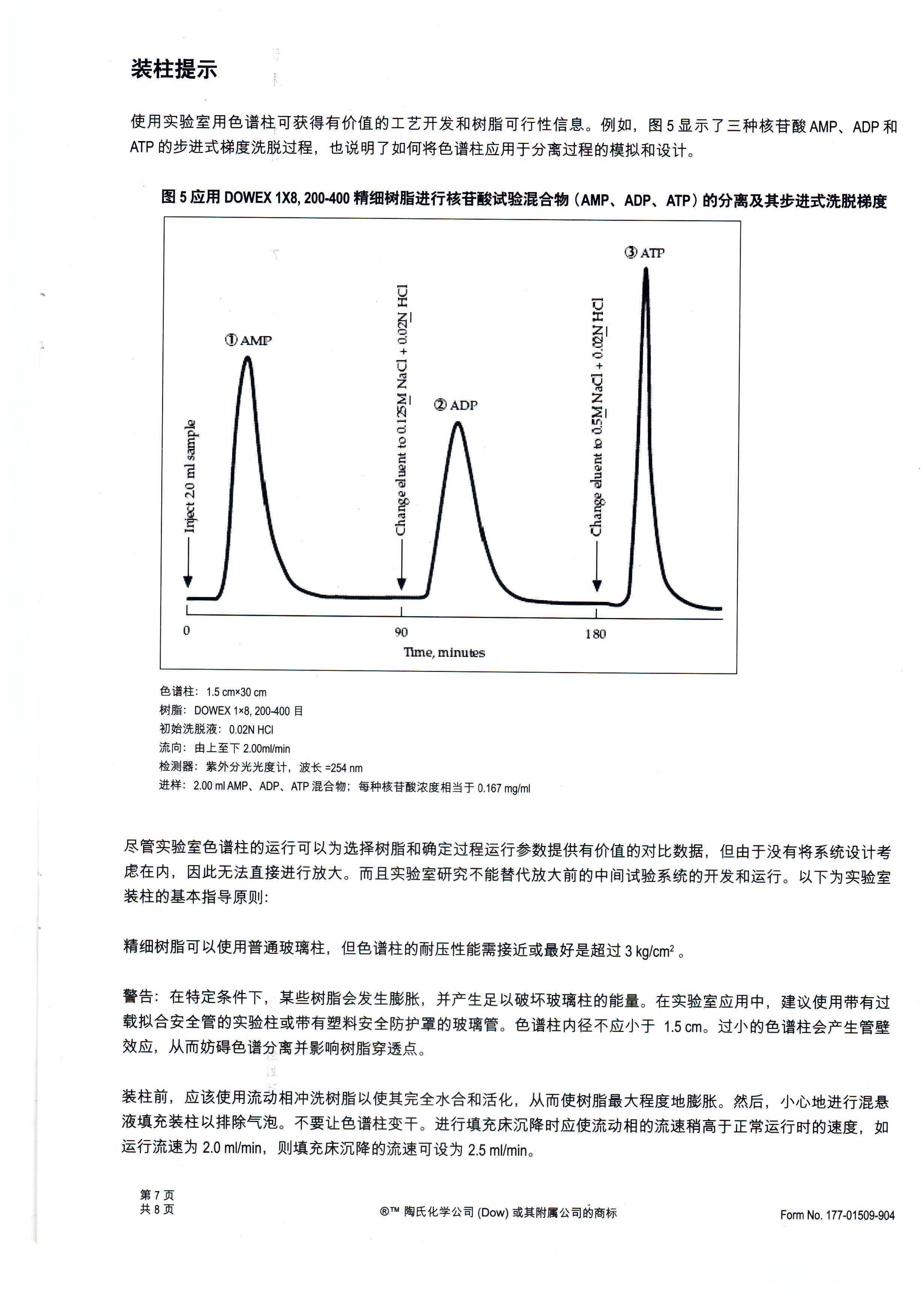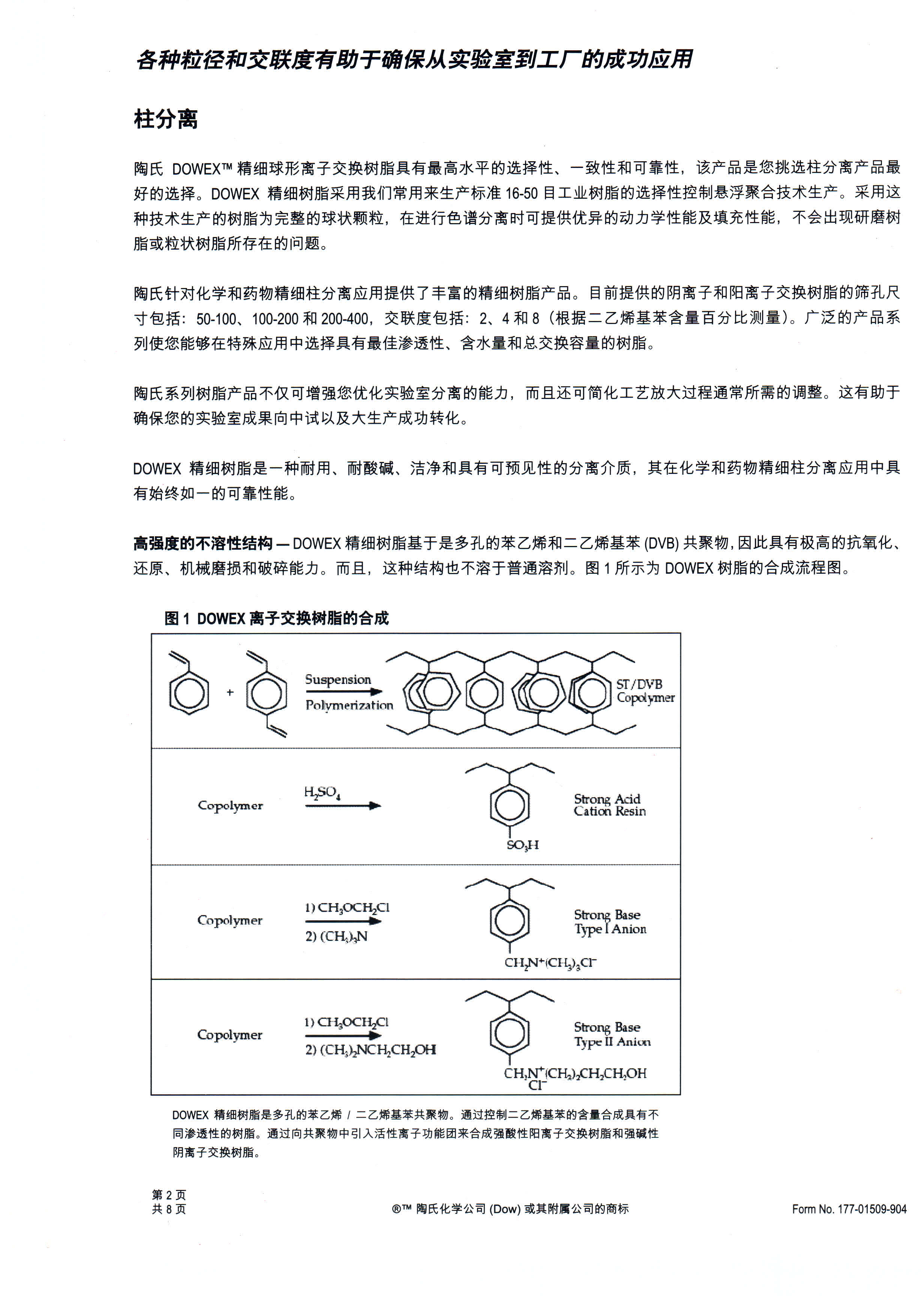 ?????? DOWEX系列離子交換色譜分離樹脂的骨架材料均為苯乙烯-二乙烯苯,采用特殊的懸浮聚合工藝大規(guī)模制備而得,具有良好的化學(xué)、物理穩(wěn)定性。易裝柱,目標(biāo)組份擴(kuò)散阻力小,產(chǎn)品質(zhì)量穩(wěn)定。因此,DOWEX系列離子交換色譜分離樹脂不僅可以滿足實(shí)驗(yàn)室食品、藥品等精細(xì)化工產(chǎn)品的小試工藝開發(fā),也使得工藝的放大更為輕松。