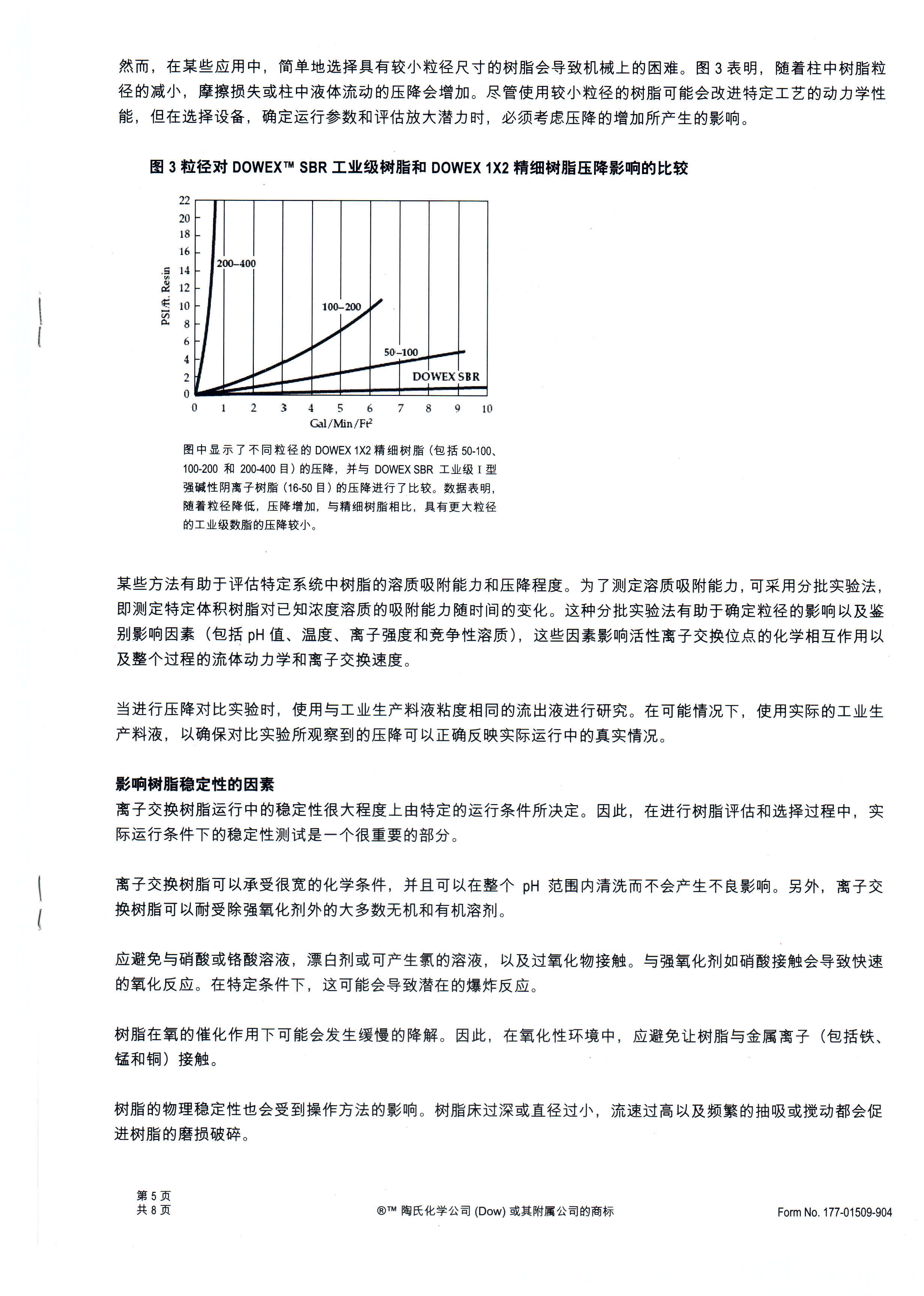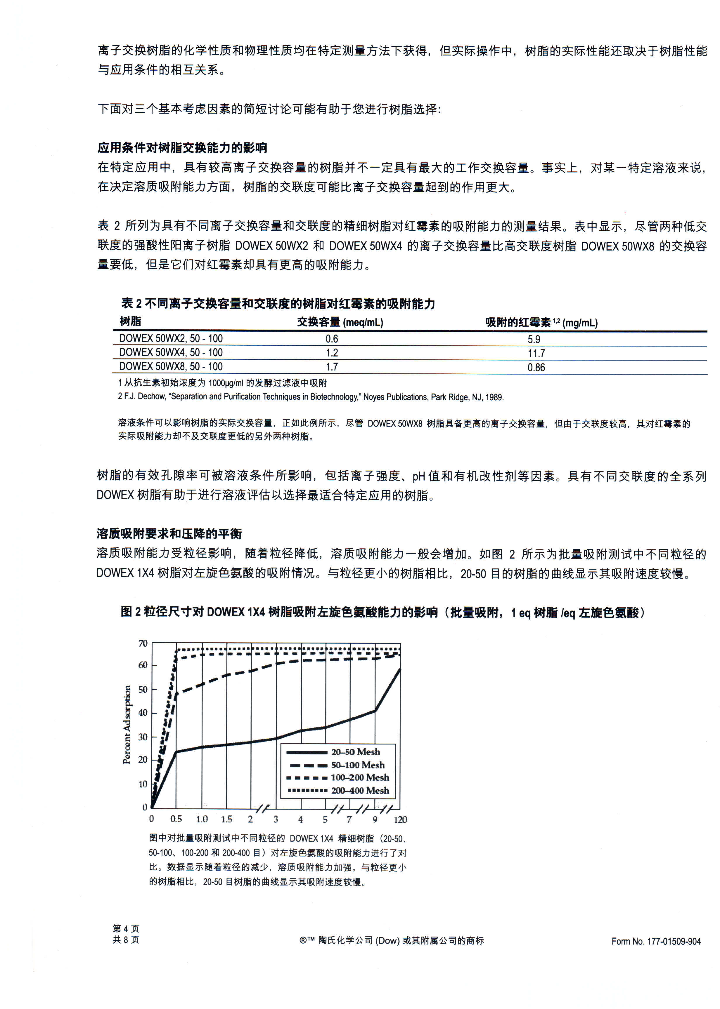 ?????? DOWEX系列離子交換色譜分離樹脂有強(qiáng)酸性陽離子交換樹脂和強(qiáng)堿性陰離子交換樹脂兩大類,每一類又根據(jù)交聯(lián)度(即DVB%)的不同劃分為3個(gè)小類,分別以“×2”、 “×4”與“×8”表示,在此基礎(chǔ)上進(jìn)一步提供3個(gè)粒度范圍可供選擇,即150-300μm(50-100目)、75-150μm(100-200目)以及35-75μm(200-400目),共計(jì)18個(gè)樹脂牌號(hào)。顯然,不同交聯(lián)度的樹脂含水量不一,體積交換量、物質(zhì)擴(kuò)散的阻力各異,如此寬泛的產(chǎn)品范圍豐富了客戶的試用選擇,可以針對具體的應(yīng)用優(yōu)選出適宜的色譜分離樹脂。