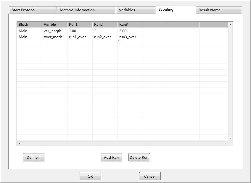 Scouting,即探索功能,通過將方法中的某些參數編輯成變量,然后通過Scouting設置,將同樣的方法運行多次,每次僅僅是自動修改方法中的某個或某些參數,從而實現參數的自動尋優,譬如尋找最適合的流速、尋找最適合的裝柱高度等。