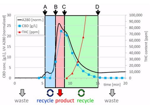 A:CBD濃度2.7 g/L(2,000 mAU)時(shí)開始進(jìn)行回收(recycle);