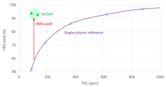 圖11為單柱層析與MCSGP收率對比圖。已規(guī)定最大THC含量為100 ppm,在這一水平,單柱層析的CBD收率僅為52%,而MCSGP的CBD收率為94%,比單柱層析高出80%。