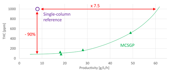 MCSGP可用于不同工藝要求。如果對目標(biāo)產(chǎn)品的純度要求并不高,采用MCSGP可使產(chǎn)率進(jìn)一步提高。比如某企業(yè)要求THC含量上限為1000 ppm時(shí),收率水平不得低于85%,用MCSGP代替單柱層析后,產(chǎn)率由原來的8 g/L/h提高到了60 g/L/h以上。而另一工藝情況為,當(dāng)從單柱層析轉(zhuǎn)換為MCSGP時(shí),保持產(chǎn)率不變,雜質(zhì)THC含量可從1000 ppm降低至100 ppm。見圖12純度 - 產(chǎn)率曲線。