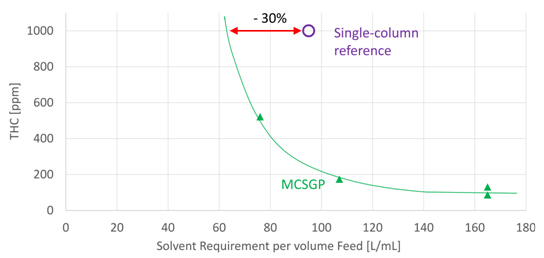 圖13顯示了單柱層析和MCSGP的溶劑消耗對比。在要求THC最大含量為1000 ppm時(shí),MCSGP可使溶劑消耗量降低30%。單柱層析的溶劑消耗量為每mL上樣樣品消耗95 mL溶劑,而MCSGP的溶劑消耗量僅為每mL上樣樣品消耗65 mL溶劑。
