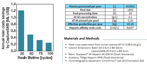 從預處理血漿中捕獲AT-III通常采用肝素親和層析法。將單柱Batch工藝與Capture SMB進行對比實驗,使用親和填料TOYOPEARL? AF-Heparin?HC-650M,用血漿上清液(AT-III:0.08-0.24 g/L)進行上樣,采用TSKgel Heparin-5PW分析柱進行濃度測定,最終研究表明,采用Capture SMB,可使填料載量提高45%,產率提高38%,同時使緩沖液消耗量降低29%。