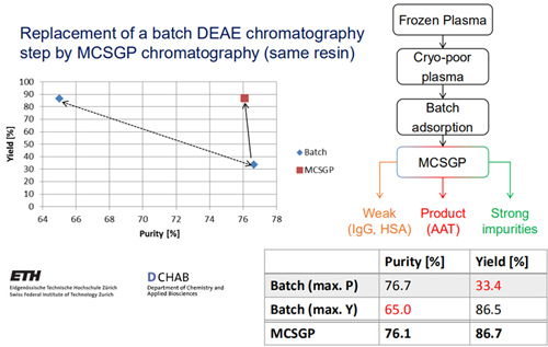從血漿中純化AAT需采用DEAE離子交換層析,有研究表明,采用單柱Batch工藝純化AAT,產品純度76.7%時,收率為33.4%;產品純度65.0%時,收率為86.5%,純度和收率此消彼長。采用MCSGP工藝后,可在產品純度76.1%時,仍保證收率為86.7%。