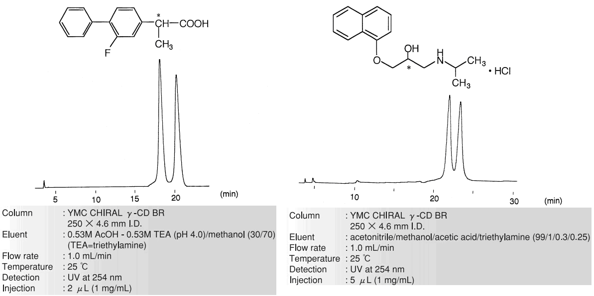 YMC CHIRAL CD BR 系列柱由鍵合有α-溴化環(huán)糊精(六環(huán))、β-溴化環(huán)糊精(七環(huán))和γ-溴化環(huán)糊精(八環(huán))的3種光學(xué)異構(gòu)體的固定相構(gòu)成。根據(jù)3種類型分離模式的不同,擴(kuò)大了化合物的分離范圍。雙重作用機(jī)制,使其與ODS具有不同的選擇性。對ODS分離困難的構(gòu)造異構(gòu)的分離有效。