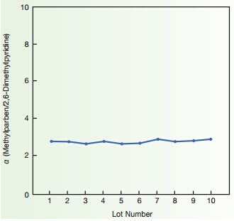 上圖所示,顯示了對羥基苯甲酸甲酯/2,6-二甲基吡啶(Methylparaben/2,6-Dimethylpyridine)在YMC-Pack ODS-AM液相色譜柱上10次的分離因子(α)。YMC公司在生產過程中采用的嚴格質量控制體系,以保證產品生產批間的差異最小,提供高再現性的堿性化合物分析柱。