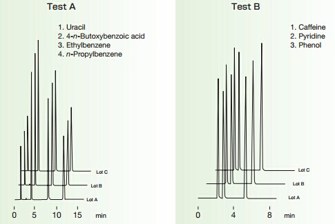 上圖為三批填料測試結果的比較,其顯示了對疏水性、親水性、堿性及酸性化合物都具有優良的分離再現性。